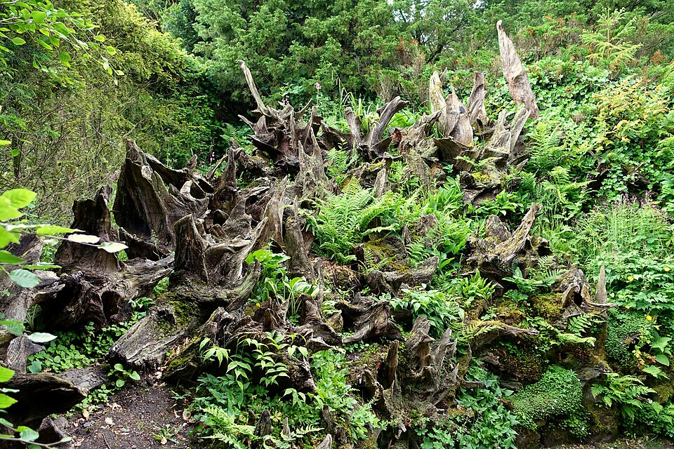 A feature composed of tree roots and stumps placed upside down into earth banks, with trailing plants festooned around them. A stumpery has been restored at Biddulph Grange, Staffordshire, and there is another at Ickworth, Suffolk.